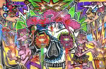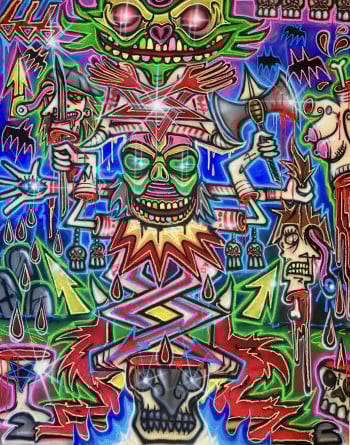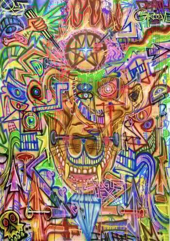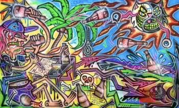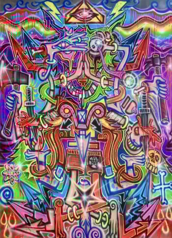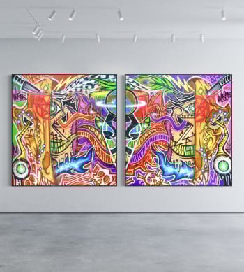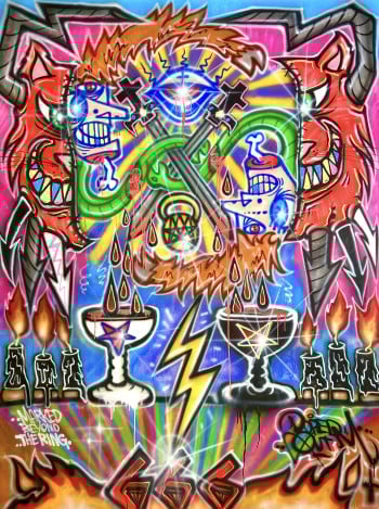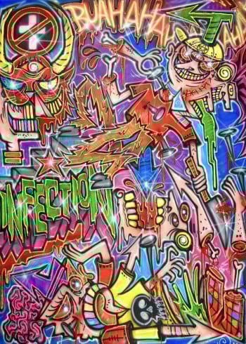Born in Rome in 1988, Doped Out M emerged from the raw edges of the Nomentana suburbs, where illegal graffiti, hip-hop, and chaos shaped his artistic DNA. From bombing walls to painting on canvas, his style remains visceral, electric, and chaotic with purpose. It’s not just graffiti. It’s a ritual. A force. A clash of symbols, ego, saints, demons, sarcasm, and collapse.