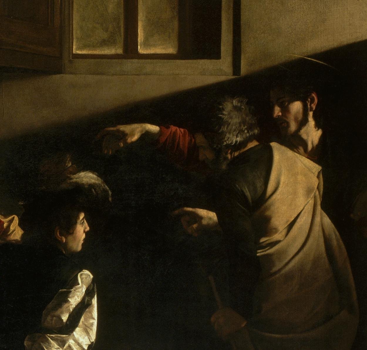 Caravaggio sets the scene in a dimly lit tavern, casting a strong beam of light onto Matthew and his companions. The interplay of light and shadow is used not just for dramatic effect but as a metaphor for spiritual awakening. The figures are dressed in contemporary clothing, linking the biblical story to the viewer's everyday life.