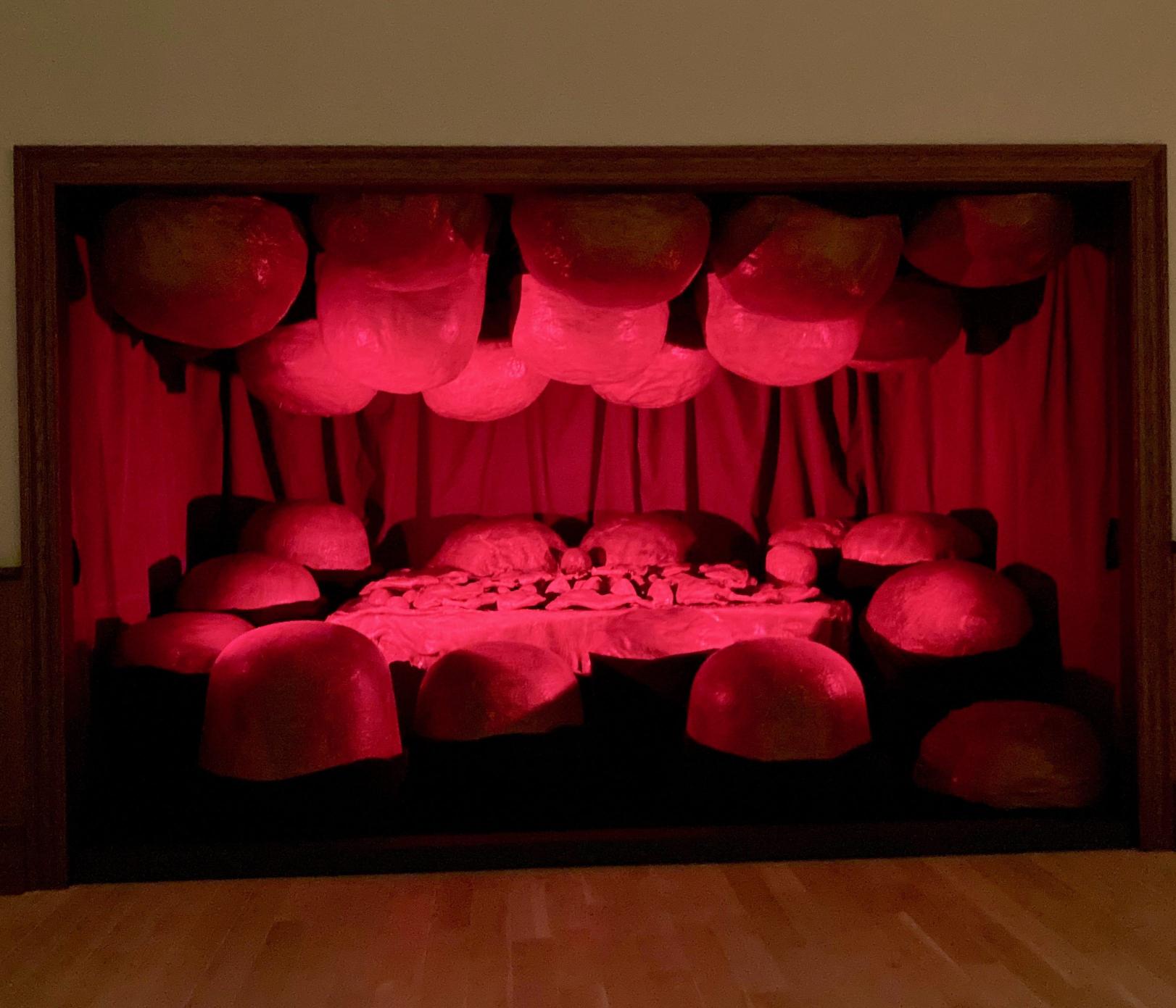 This visceral assemblage, composed of latex, fabric, and plaster, stages a symbolic response to patriarchal authority and familial conflict. It is a dinner table transfigured into a battlefield, signifying both consumption and destruction, and blurring the lines between violence and catharsis.