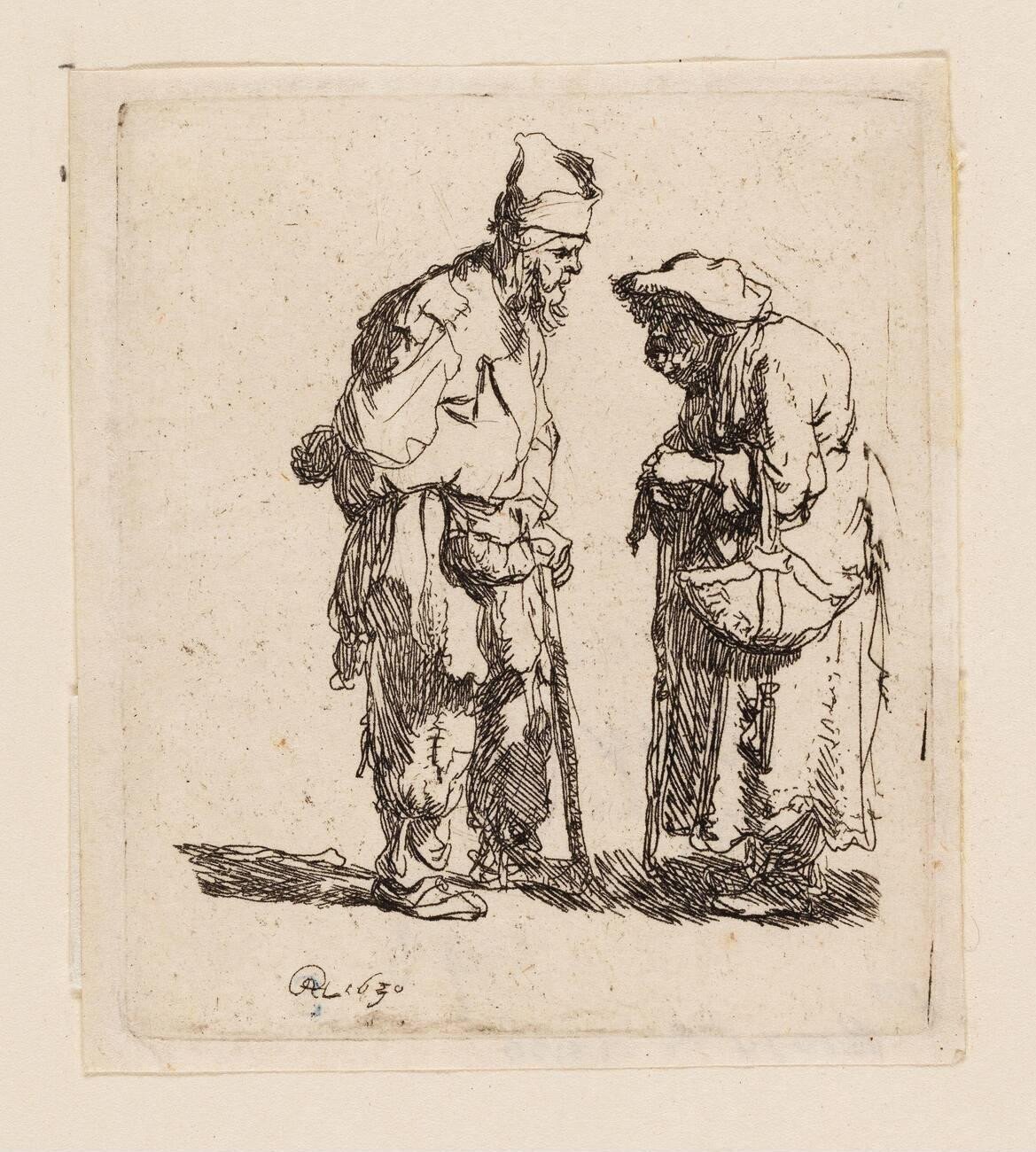 Rembrandt made countless sketches of ordinary people, from beggars and peasants to servants and children. One such study, Two Studies of Beggars and a Woman with a Child (1630s), reveals his fascination with honest, unidealized subjects. These drawings show his consummate skill as a draughtsman and his belief that beauty lay in truth, no matter how humble or rough