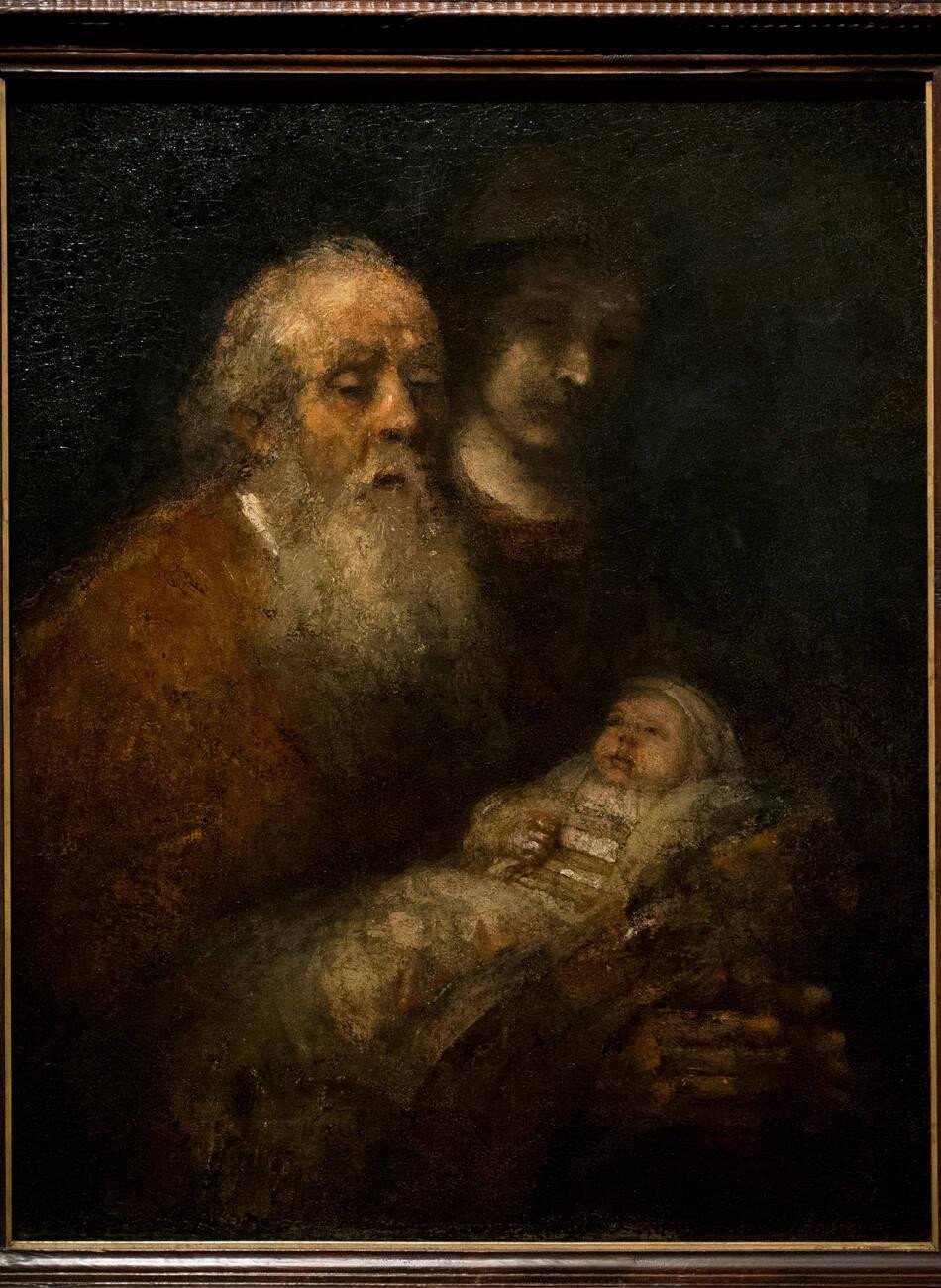 Painted in dim colors and sparse details, this small painting nevertheless exudes extraordinary power. It depicts the biblical Simeon, who had been promised by God that he would live to see the Messiah. Simeon’s worn but serene face is lit softly, his focus entirely on the infant Christ.