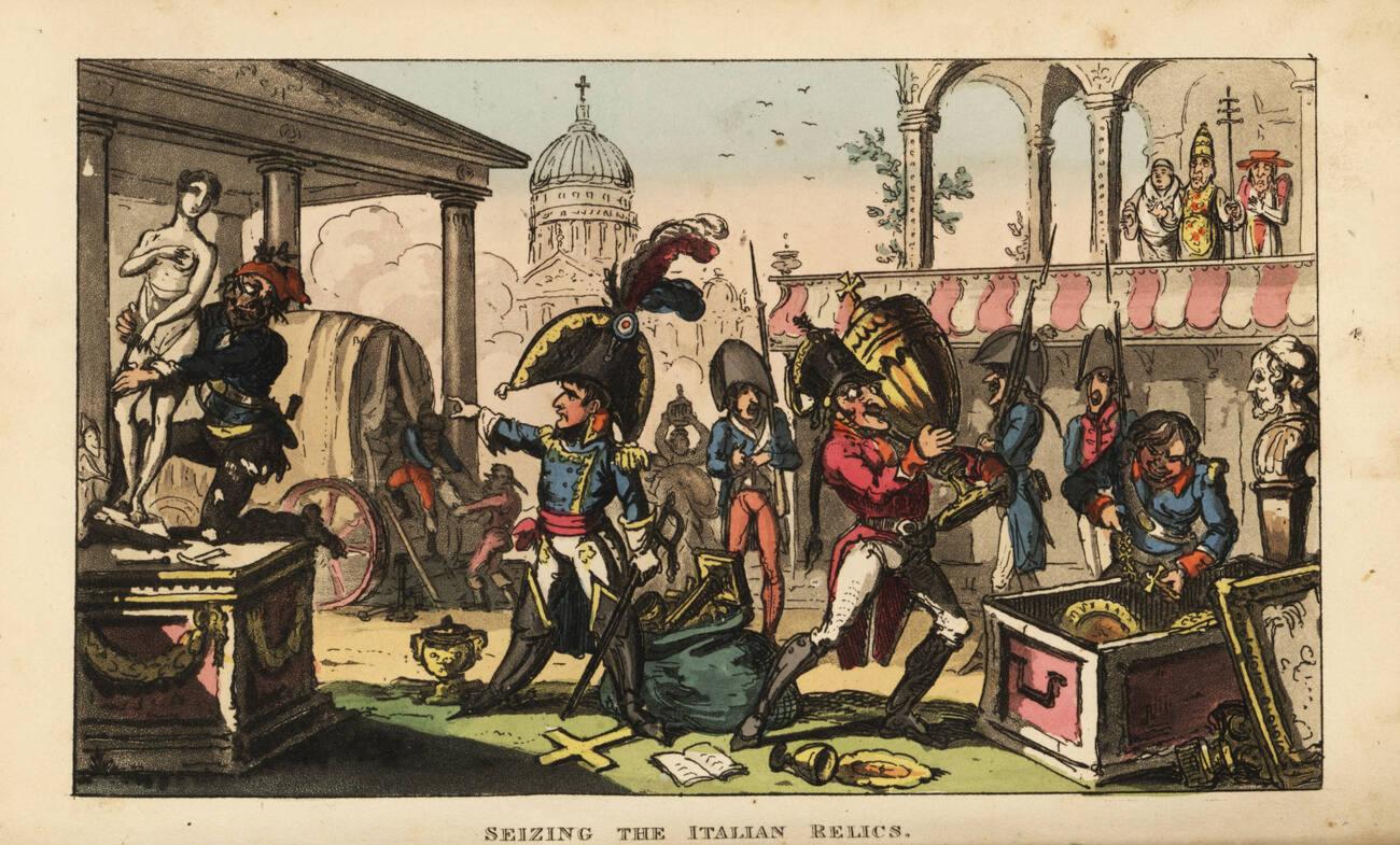 Napoleon Bonaparte and the Revolutionary Army looting artworks and relics in Milan during the Italian Campaign, 1796.