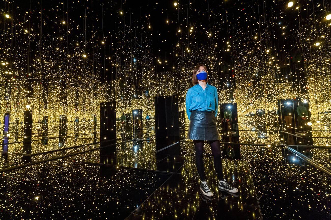 Perhaps the most celebrated manifestation of this theme is her “Infinity Mirror Rooms,” immersive environments lined with mirrors that transform finite spaces into dazzling illusions of boundlessness. First created in 1965 with “Phalli’s Field” (where phallic forms cover the floor, endlessly reflected), these installations have evolved over decades and become among the most popular—and photographed—art attractions worldwide. Visitors are enveloped in a cosmic kaleidoscope, fostering both awe and introspection. Through these works, Kusama invites viewers to lose themselves, collapse boundaries, and contemplate their place in the vast universe.