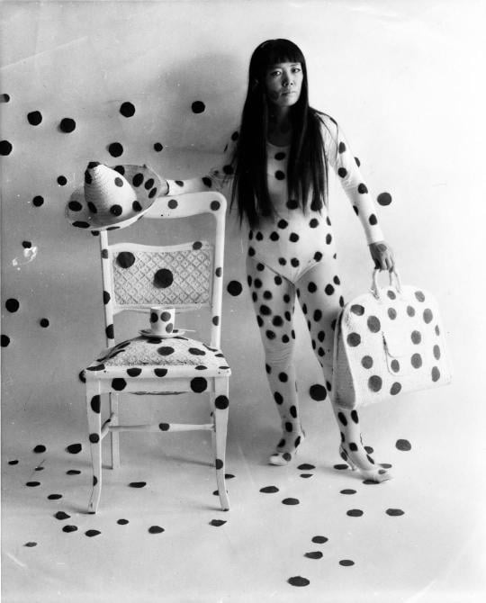 Yayoi Kusama with Infinity Net paintings in her New York studio, 1961