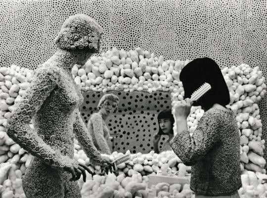 New York during the late 1950s and 1960s was the epicenter of the avant-garde. Kusama entered a male-dominated field in the midst of Abstract Expressionism, Pop Art, Minimalism, and the burgeoning counterculture. The city was home to icons such as Andy Warhol, Donald Judd, Claes Oldenburg, and Carolee Schneemann, many of whom would become Kusama’s peers (and, sometimes, her competitors). Despite initial isolation and financial hardship—Kusama lived in near poverty, working in abysmal conditions and sometimes going days without enough to eat—she was undaunted in her artistic pursuits.