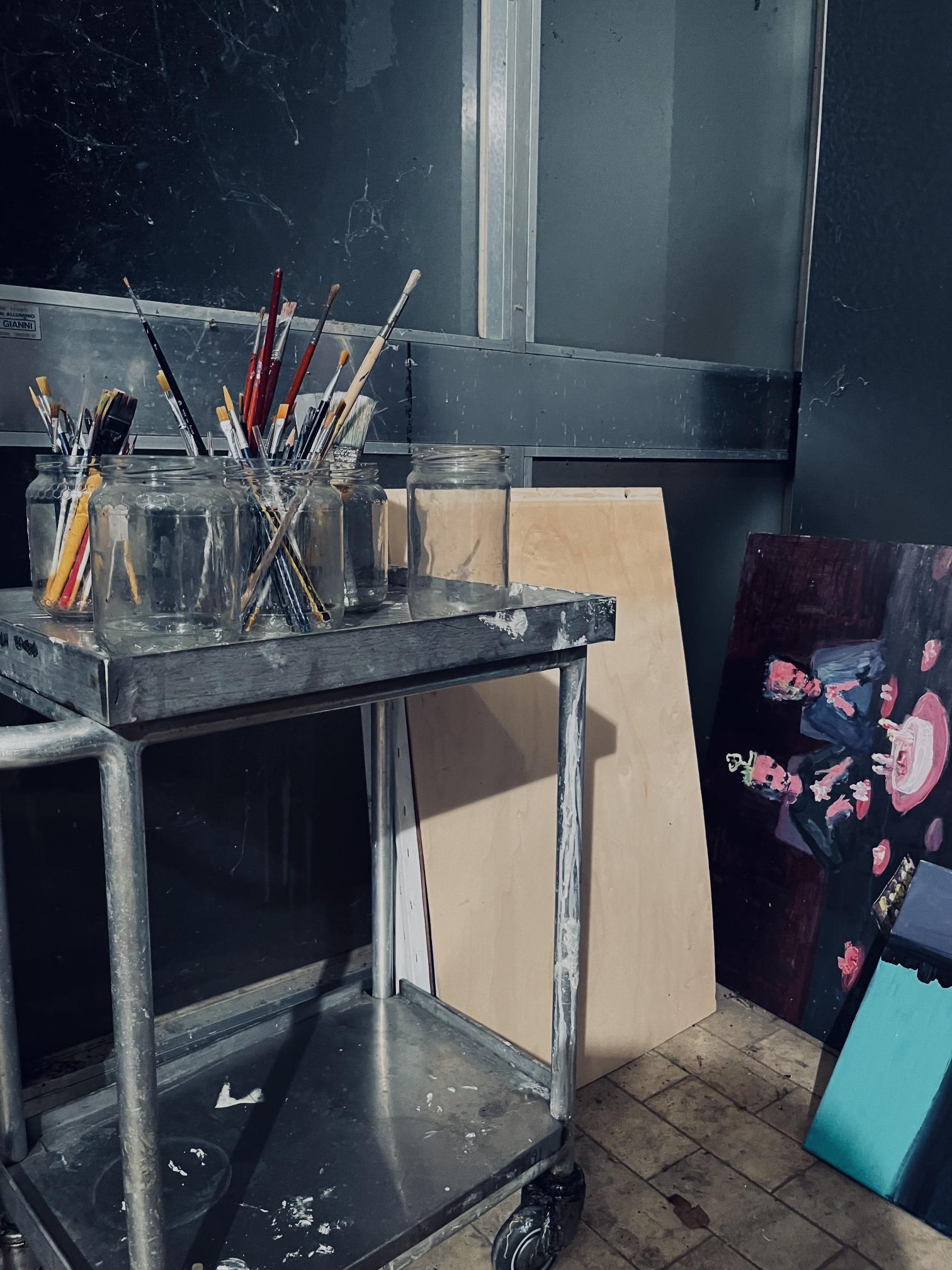 Gangi works primarily in oil paint, which he values for its consistency and depth. Recently, he has begun incorporating acrylic into his practice, appreciating its capacity for artificial tones, metallic reflections, and brilliance. This material contrast allows him to juxtapose organic and synthetic qualities within a single composition.