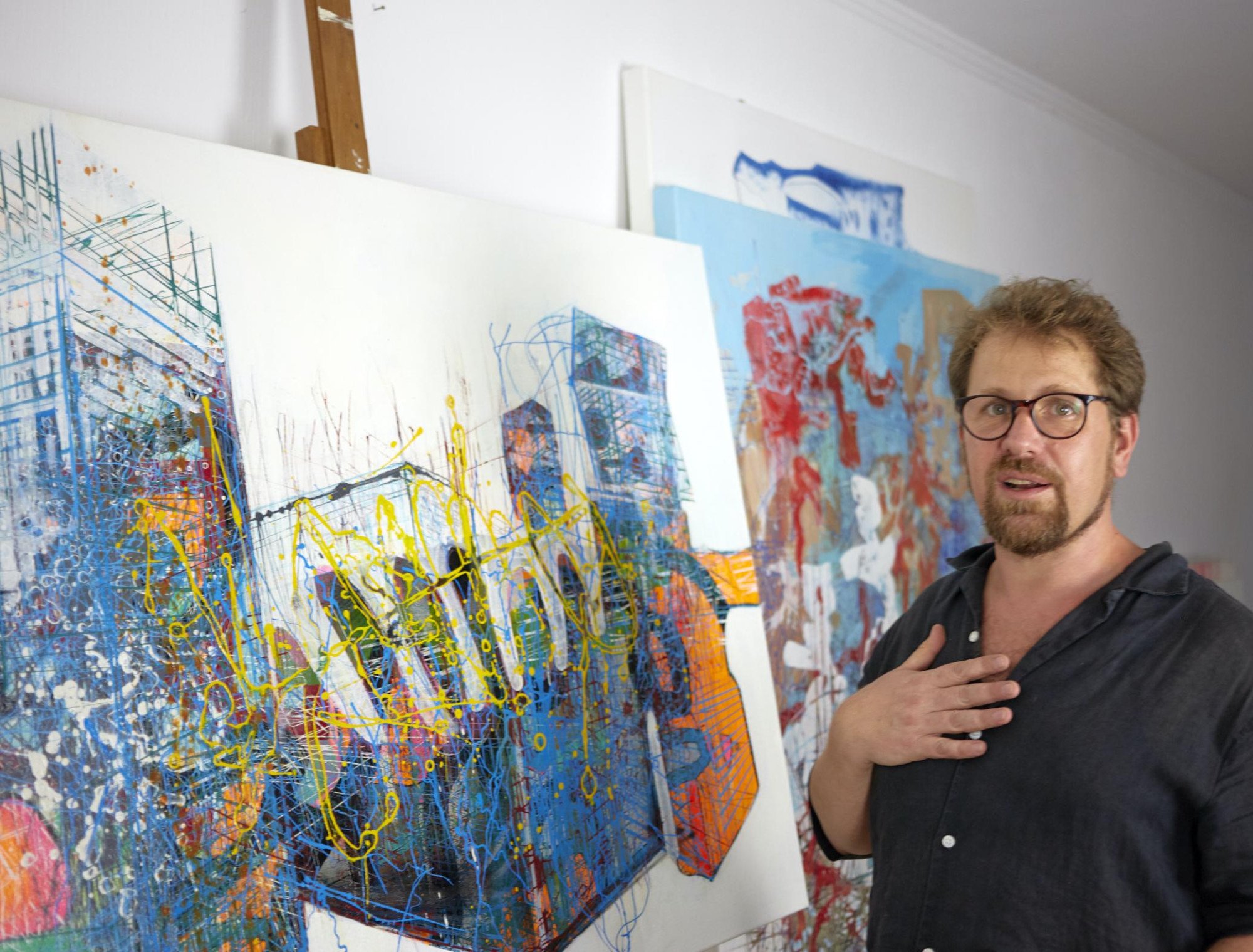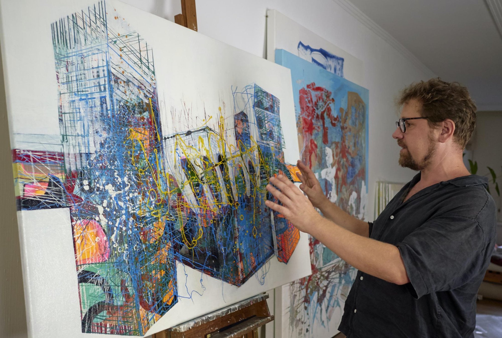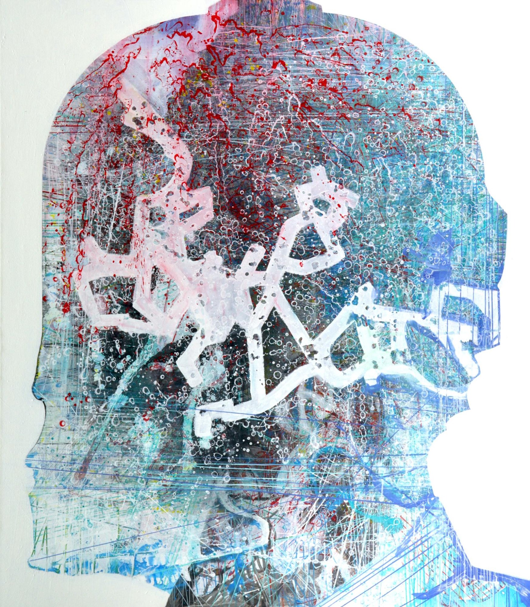 In his paintings, Nobis translates this principle into multi-layered compositions on the canvas that evoke a profound spatial depth for the observer. This depth seems to unfold either into an infinite expanse or to the canvas's periphery. He further elaborates on this dimensionality by incorporating silhouettes that transform these depths into recognizable objects. From a distance, the viewer may identify these shapes as distinct forms—perhaps reminiscent of a head or an urban landscape—while a closer inspection reveals a more complex interplay of elements akin to looking through a window into a space that transcends the physical boundaries of the canvas.