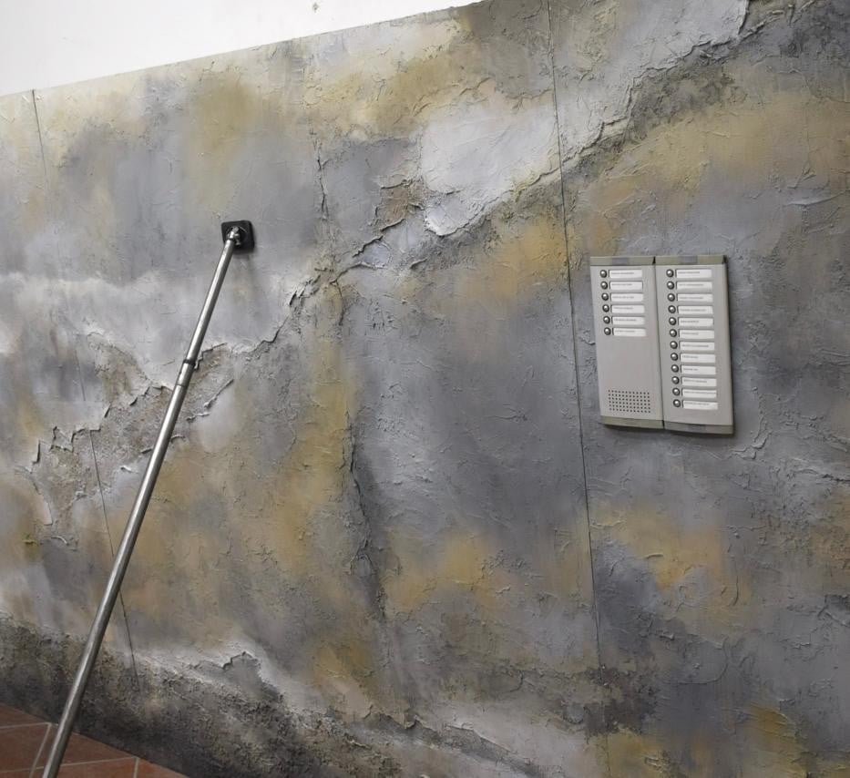 The installation WE’LL BE THERE exemplifies Caldara’s exceptional ability to merge scale with poignancy. The work features a crumbling wall bearing the names of Iranian students who were victims of an oppressive regime. When viewers press intercom buttons embedded in the sculpture, a haunting bell sounds, evoking a collective sense of loss.