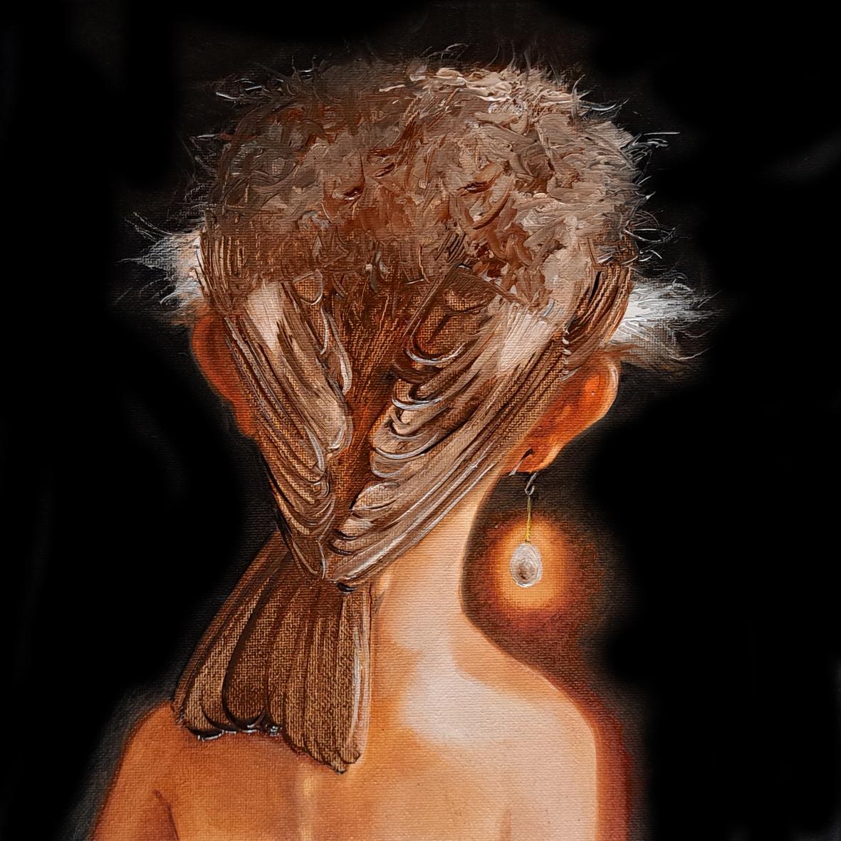 "Girl with a egg earring": A clever subversion of Vermeer's classic, this piece replaces the pearl with an egg, a potent symbol of unrealised potential and nascent life. It exemplifies Derevyanko's ability to engage in art historical dialogue while infusing it with her unique psychological vocabulary